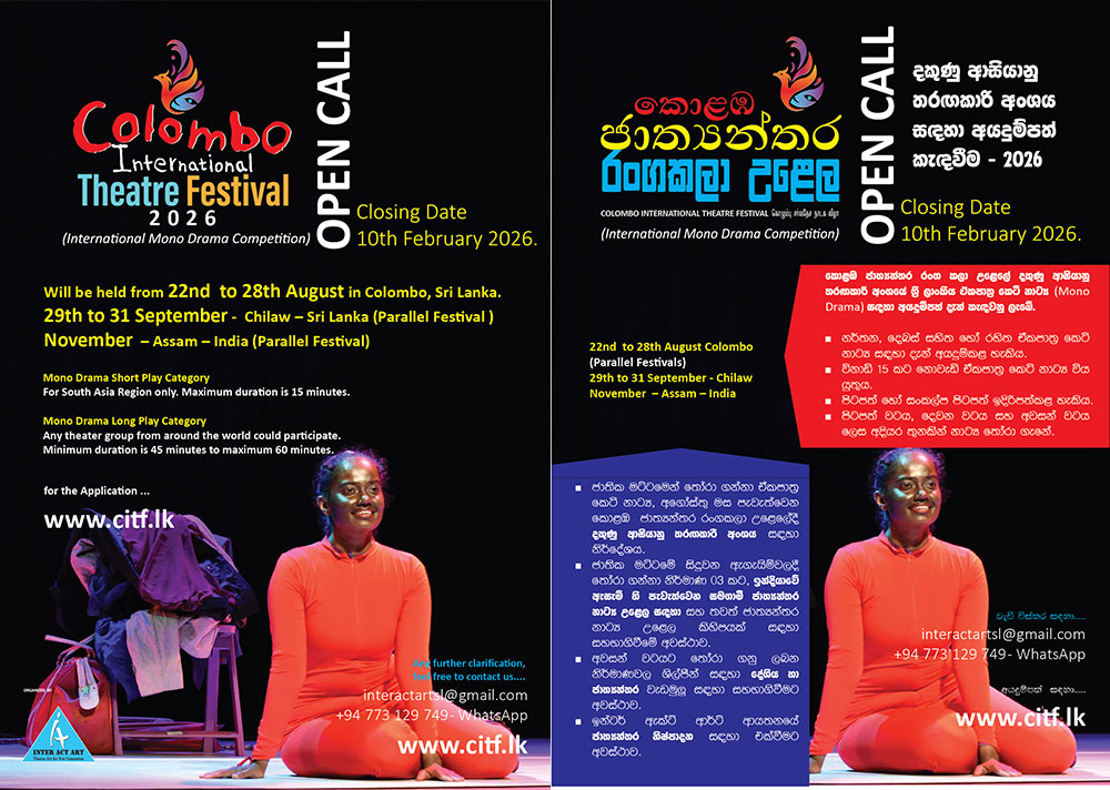 The Colombo International Theater Festival, which commenced in 2012 is approaching its successive 11th edition. CITF 2025 will feature Mono Drama from across the globe, formal and informal interactions between artists from Sri Lanka and abroad, towards a sustained effort in curating a festival with a purpose of bringing innovative performances to Sri Lanka.